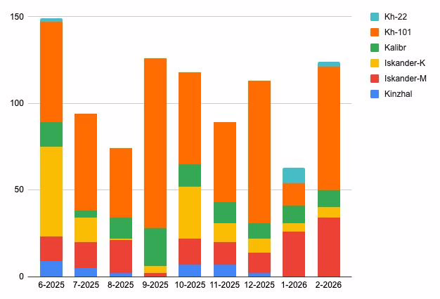 Únor se z hlediska ruských úderů vyznačuje rekordním počtem odpálených balistických střel, což je patrné především u typů Iskander-M a Kinžal. Zároveň však došlo k posunu i na straně obrany – ukrajinská PVO dokázala zachytit přibližně třetinu těchto střel, kolem 33 %, což je na poměry balistických cílů mimořádně vysoký podíl. Právě balistické střely patří mezi nejobtížněji zachytitelné prostředky kvůli své rychlosti a letové trajektorii, takže takto vysoká úspěšnost interceptů představuje významný výkon. Struktura ruských úderů se přitom dále proměňuje. V aktuálním měsíci již nelze očekávat výraznější nasazení střel Ch-101 a použití Kinžalů zůstává spíše omezené. Hlavní váha úderů se tak přesouvá k balistickým prostředkům, které mají kratší čas letu a obecně kladou větší nároky na protivzdušnou obranu.