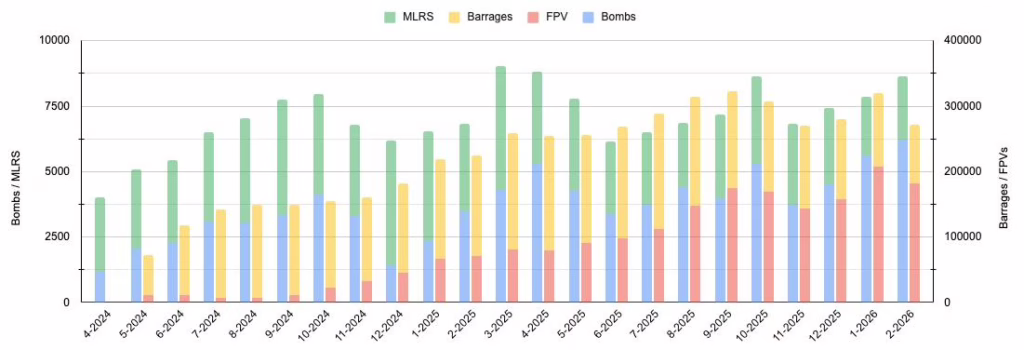 Souhrnná čísla ukazují extrémní objem ruské palby: 5 060 dronů, 288 střel včetně 116 balistických, 6 224 klouzavých pum, 182 552 FPV dronů, 88 564 dělostřeleckých přehrad a 2 425 salv MLRS, přičemž denní tempo přehrad se ustálilo kolem 3 000 a postupně se z nich stává spíše specializovaný nástroj podobně jako MLRS, zatímco hlavní tíha tlaku se přesouvá na FPV, balistiku a letecké pumy; protivzdušná obrana zachytila 170 střel, s úspěšností kolem 87 % u dronů a přibližně 33 % u balistických střel, což jsou při dané intenzitě velmi solidní výsledky, a celkem bylo zasaženo 281 lokalit a dalších 91 utrpělo škody pádem trosek. Ruská strategie se přitom zásadně nemění (více pum, více balistiky, masivní nasazení FPV) zároveň je však zřejmé, že schopnost AFU tento tlak absorbovat rovněž roste díky adaptaci PVO, disperzi a fortifikaci, takže na horizontu se rýsuje určitá forma palebné patové situace, kdy objem útoků i obranná kapacita rostou paralelně, přičemž otázkou zůstává, zda jde o skutečnou rovnováhu, nebo jen dočasnou iluzi v době, kdy Rusko dál systematicky akumuluje síly pro další fázi opotřebovací války.