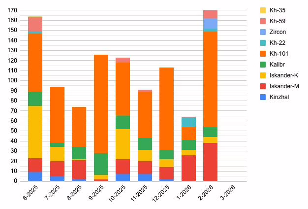 Únorová data ukazují poměrně vyváženou, ale strukturálně posunutou skladbu ruských úderů. Podle souhrnu Vzdušných sil Ukrajiny bylo v únoru odpáleno 3 střely Kinžal, 10 Kalibr, 87 Ch-101, 7 Ch-22, 12 Iskander-K, 35 Iskander-M, 8 Zirkon a 8 Ch-59. V porovnání s průběžnými denními hlášeními je patrné, že skutečný počet některých typů byl mírně vyšší, zejména u Ch-101 (95 oproti 87) a Iskander-M (38 oproti 35), zatímco u Cirkonů (10 vs. 8) či Iskander-K (6 vs. 12) se objevují rozdíly dané metodikou započítávání a následnou verifikací. Dominantní roli si i nadále drží Ch-101 jako hlavní prostředek dálkových přesných úderů, avšak výrazný podíl balistických Iskander-M a přítomnost Cirkonů potvrzují pokračující důraz na zbraně s kratší reakční dobou a vyšší průrazností. Použití Kinžalů zůstává omezené a spíše symbolické. Celkově únor zapadá do trendu posledních měsíců; kombinace řízených střel s balistikou s cílem zatěžovat protivzdušnou obranu vícevrstevnatě a nutit ji rozptylovat prostředky napříč různými typy hrozeb.